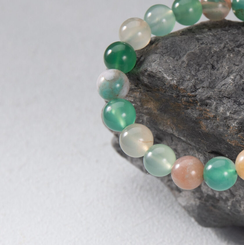Green Blossom Agate is known as a stone of calm renewal, gently supporting emotional balance and inner expansion. Its soft green tones and natural cloud-like patterns symbolize growth, new beginnings, and a peaceful mindset. Wearing this bracelet may help soothe stress, encourage clarity, and bring a sense of quiet confidence throughout your day. Designed for daily comfort, the bracelet uses a smooth flat elastic cord that rests softly on the wrist. It is available in eleven thoughtfully spaced sizes — from 13 cm up to 23 cm — allowing you to find a natural, flexible fit that follows your movements without feeling tight or restrictive. A piece created to accompany you with serenity, wherever you go.