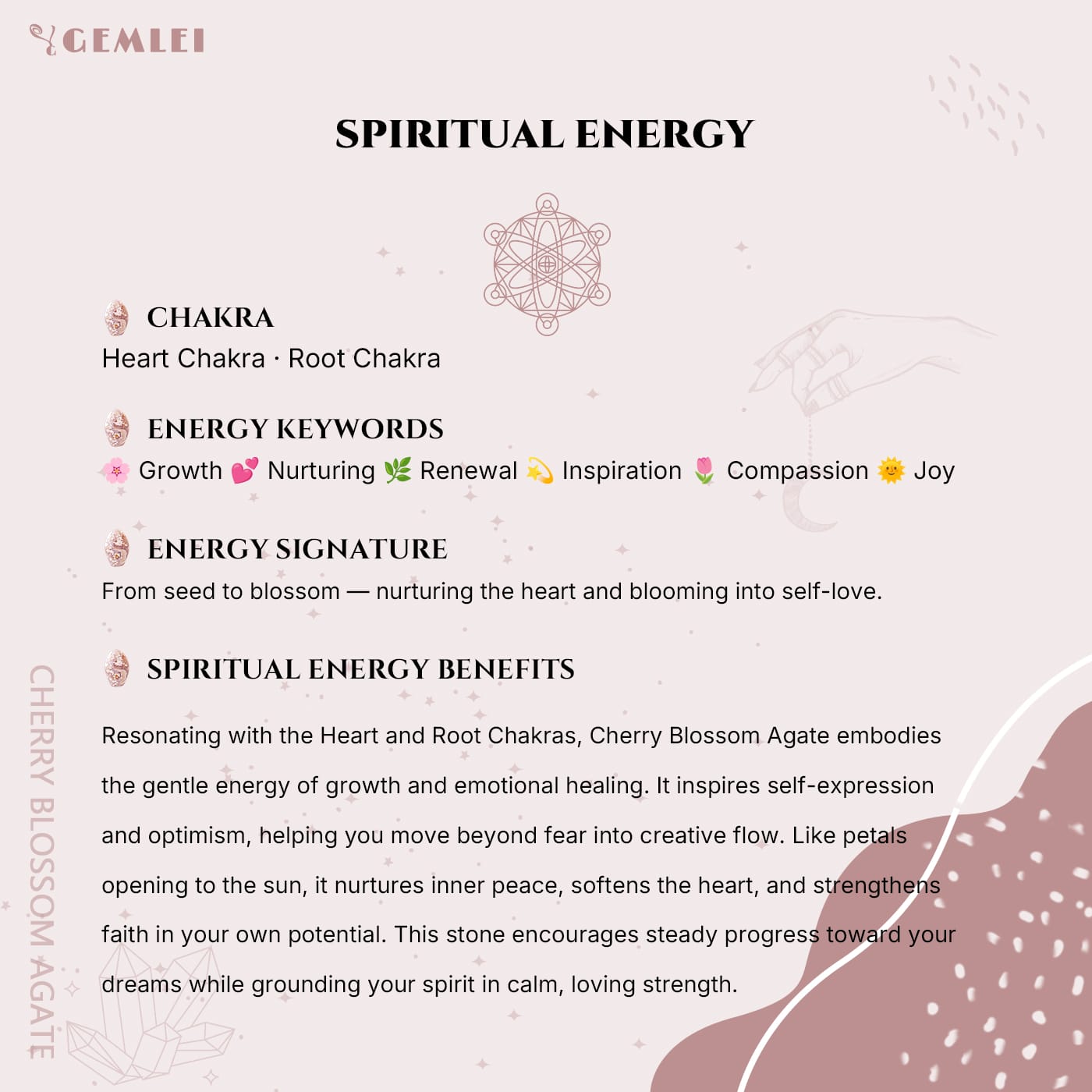 A symbol of gentle growth and blooming potential, Cherry Blossom Agate carries the soft awakening energy of spring. It nurtures the heart, dissolves emotional heaviness, and encourages dreams to unfold with grace. Like petals opening to sunlight, it inspires hope, creativity, and inner renewal, guiding the spirit toward joy, balance, and heartfelt expansion.